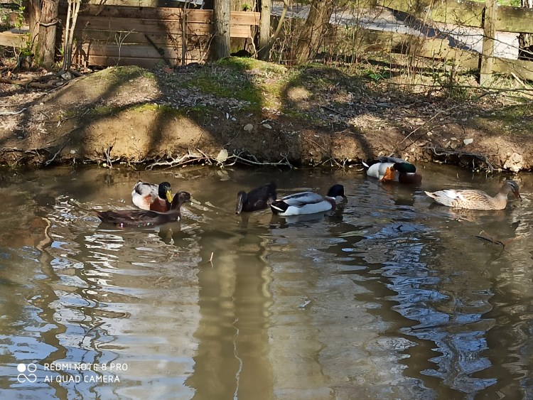 Unsere Laufenten wohnen idyllisch an ihrem Teich unter einer großen Trauerweide.