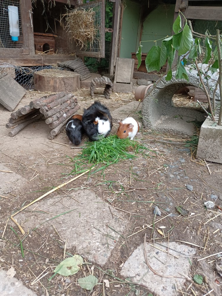 5 Meerschweichchen leben draußen unter Bäumen in einem großen Gehege.